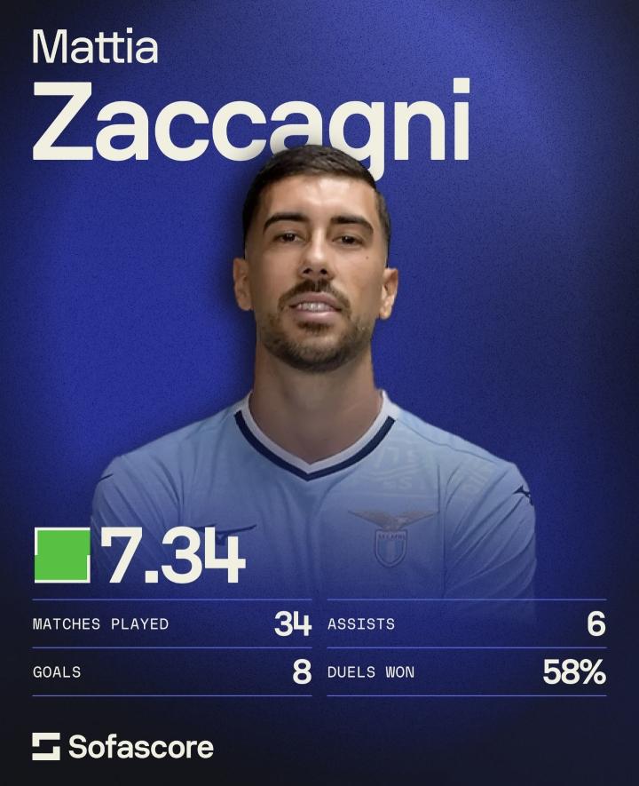 昨天,备受关注的体育数据统计分析机构Sofascore发布了2024/2025赛季意甲联赛最佳球员的消息,结果让人们颇为意外,因为这个奖项授予了拉齐奥队的队长马蒂亚·扎卡尼。扎卡尼在上个赛季的表现实在令人瞩目,他在意甲联赛中共出场34次,攻入8球,并有6次助攻,以惊人的胜率58%脱颖而出,更值得一提的是,在Sofascore网站上他获得了惊人的7.34的平均评分。